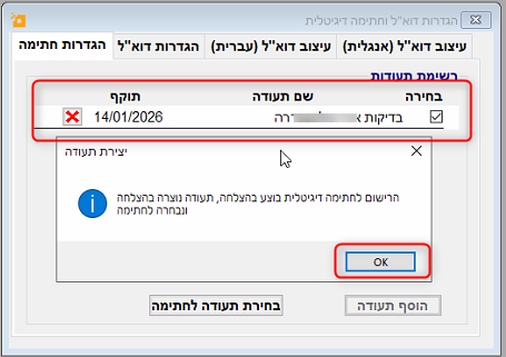 4. בסיום התהליך נוצרה תעודה לחתימה, והיא מסומנת באופן אוטומטי ב-וי.