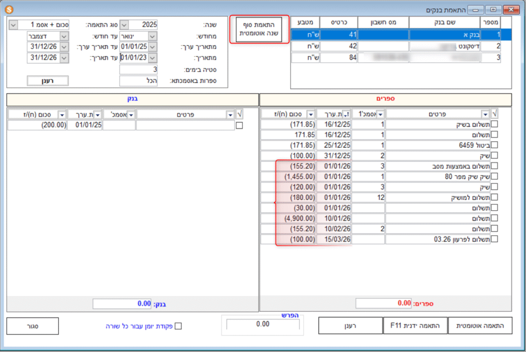 שימוש בכפתור "התאמת סוף שנה אוטומטית" בהתאמות בנק