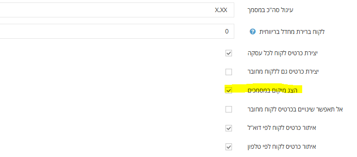 על מנת לפתוח את האפשרות הזו, במסך “הגדרות בית העסק” בממשק הניהול – סמנו וי בשדה “הצג מיקום במסמכים”: